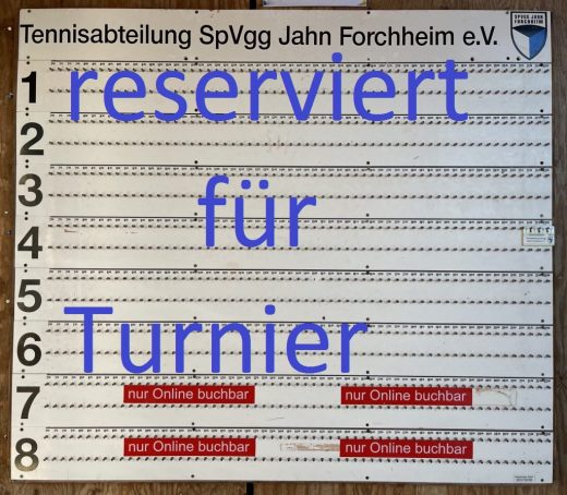 bitte beachten, da am Samstag, 06.08.22 ab 09.00 das gemeinsame LK Turnier mit TC und Jahn Forchheim stattfindet, sind die Plätze 1-6 für das Turnier reserviert, die Plätze 7 & 8 sind weiter online buchbar.