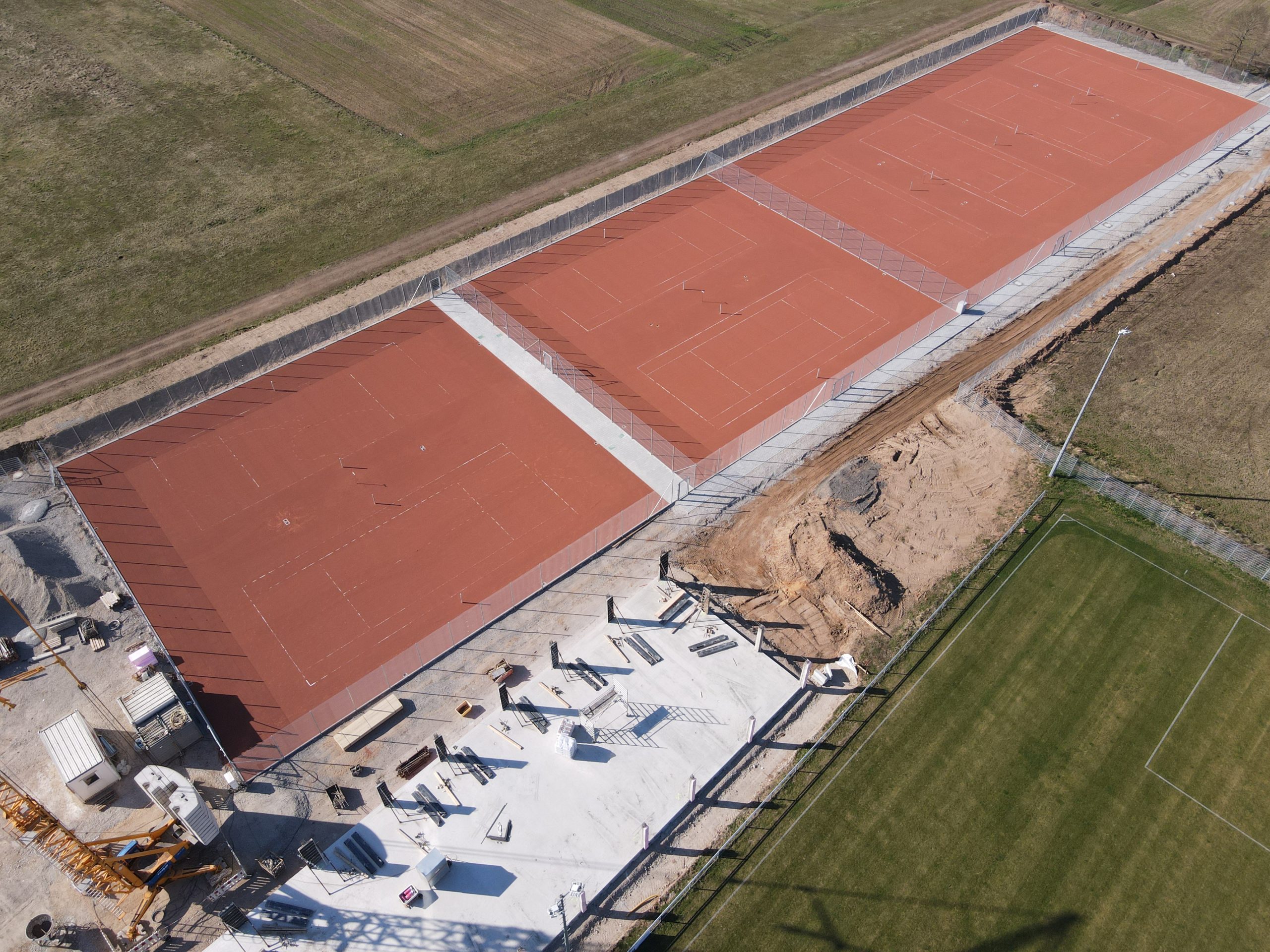 Die Plätze werden in den nächsten Tagen mit vereinten Kräften im Rahmen eines Arbeitsdienstes endgültig fertiggestellt, und werden sich zur Eröffnung in einem TOP Zustand präsentieren. Bei den Nebenanlagen wird es noch etwas dauern, wie Ihr auf den Bildern unschwer erkennen könnt. Provisorische Sanitär- und Duschkabinen erlauben es uns jedoch, endlich auf neuem Belag in diese Saison zu starten.